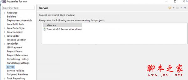 (2)在项目上右键Properties 选择Server 发现当前选择的服务器为<None>,选择下面的Tomcat v8.0 Server at localhost