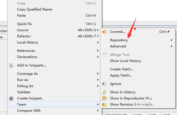 3、选中了team的选项之后,进行选择为repository的选项菜单。