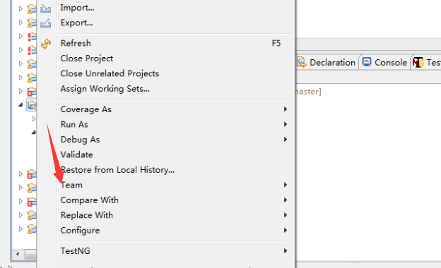 2、进行右键项目后,弹出了下拉菜单中进行选择为“team”的选项