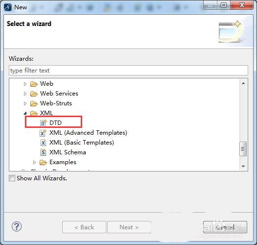 4、然后可以看到一个XML文件夹,展开选择DTD。