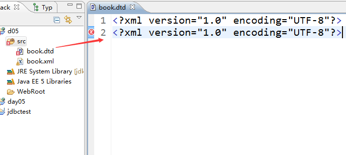 6、然后你就可以看到你所创建的dtd文件了。如果是myeclipse10.7版本的话可能是错误的。因为他有两个xml的声明,你要删除一个才行。