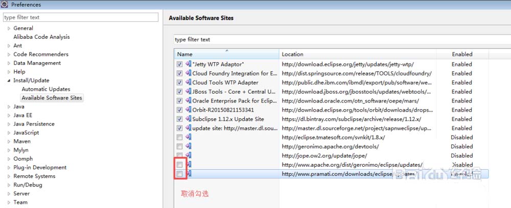 2、window-preference打开eclipse的设置。在updates-vailable software sites中,把无效的地址取消勾选