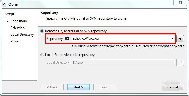 2、然后弹出对话框,先填写Repository URL。然后Next。