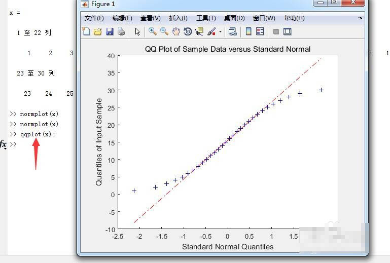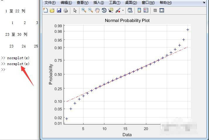 2、对它进行概率分布的可视化介绍,通过正态概率分布函数normplot,还有Q-Q图来进行操作,如图