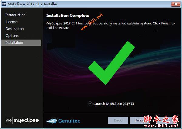 5.当安装结束后,点击“finish”即可退出安装向导,不过事先把“launch Myeclipse 2017 Ci”√去掉