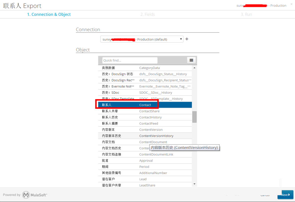 6、点击导出,可以看到好像是salesforce中所有的数据都可以导出吧!ok,我们选择联系人点击next