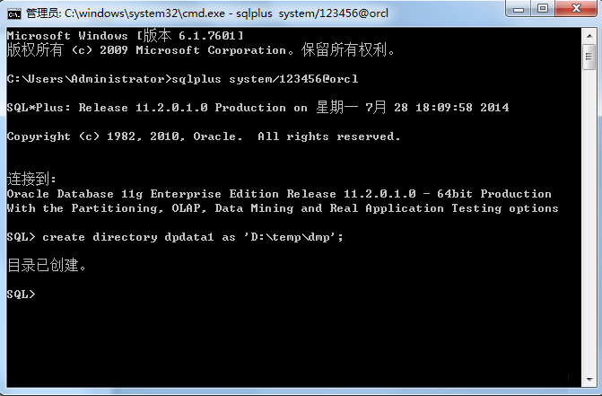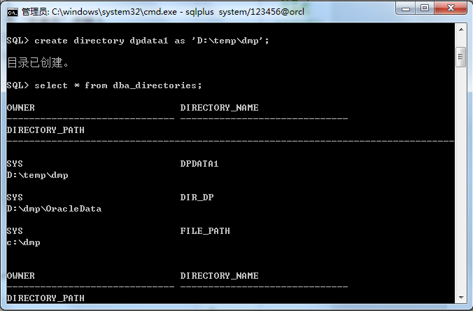 1、sql>create directory dpdata1 as 'D:\temp\dmp';这仅仅是在oracle里设定的目录,并没有真正创建