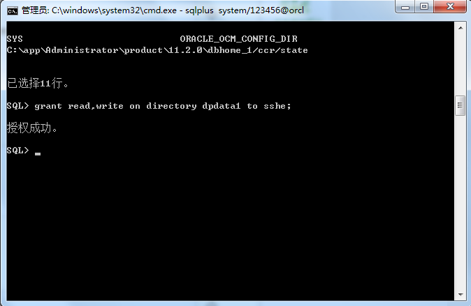 3、赋于要导出数据表的所属用户权限 sql>grant read,write on directory dpdata1 to sshe;