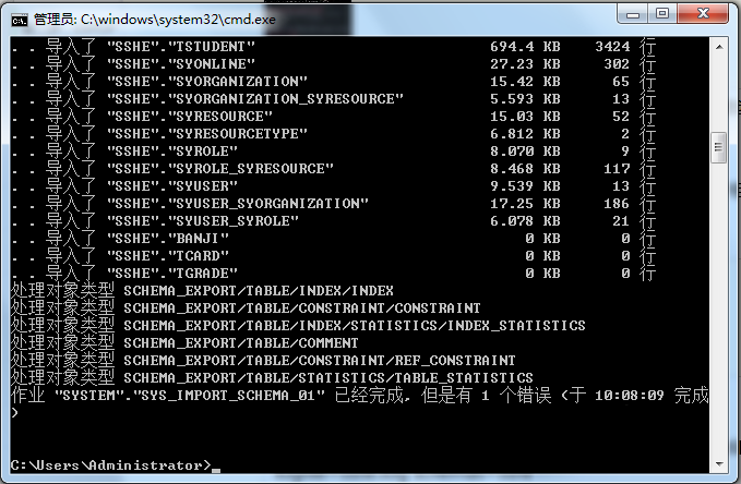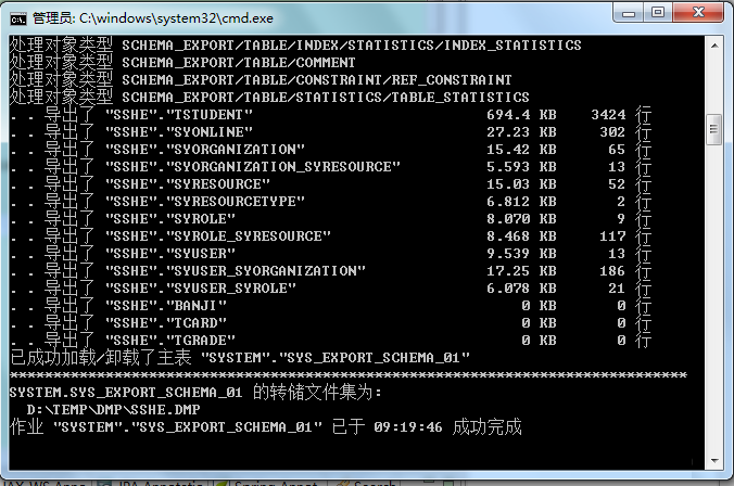 输入导入命令:impdp system/123456@orcl directory=dpdata1 dumpfile=SSHE.DMP logfile=sshe.log schemas=sshe