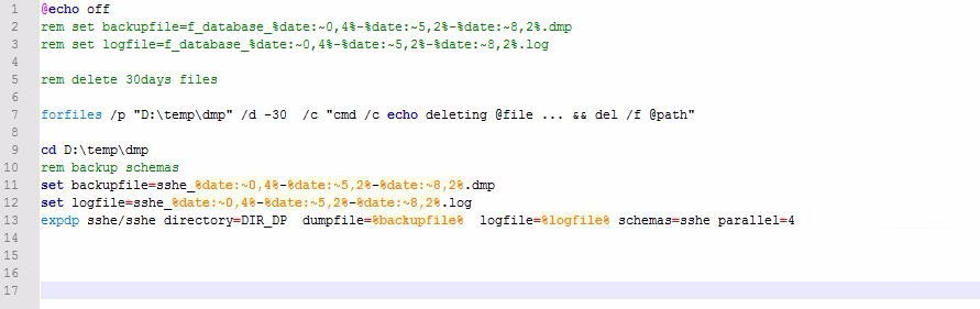 expdp sshe/sshe directory=DIR_DP dumpfile=%backupfile% logfile=%logfile% schemas=sshe parallel=4