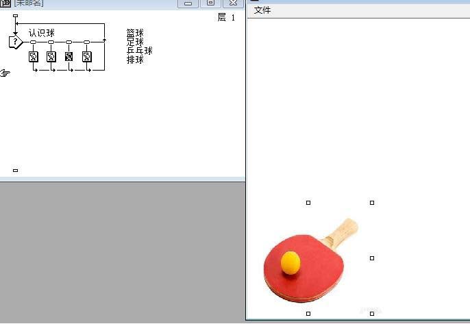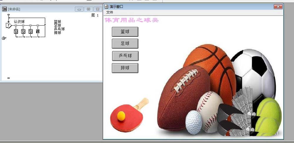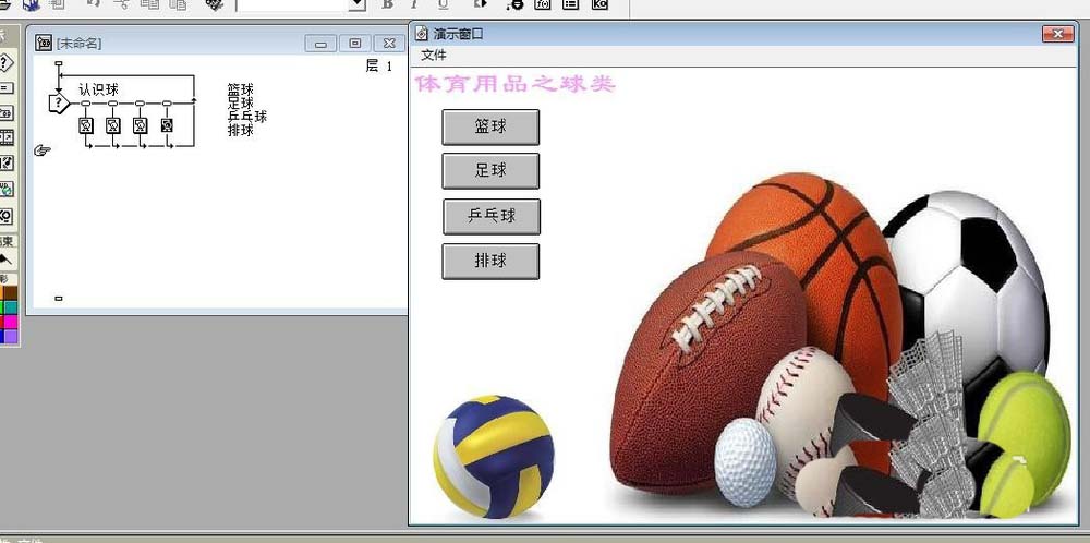 5、按照同样的方法依次添加一足球、乒乓球、排球显示图标,并在其相应的演示窗口中插入相应的图片。