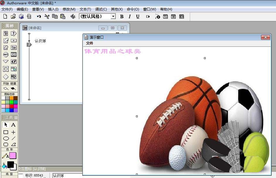 2、双击交互图标,在弹出的演示窗口中,利用文字工具输入一行文字:体育用品之球类,再插入一张图片作为背景。