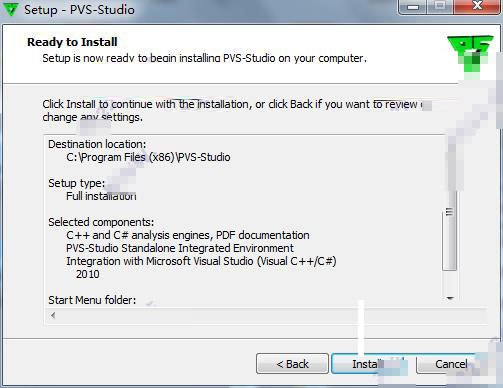 7、显示刚才用户所设置的PVS-Studio属性,若有误可点击Back返回修改,无误则可点击Install开始正式的安装