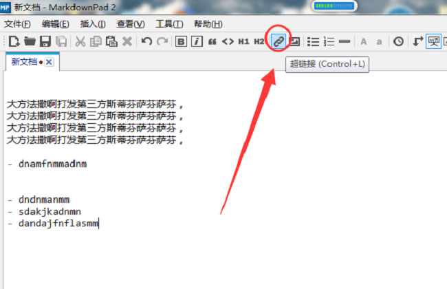 6、如果你的文章要插入链接,选择如图中工具栏的超链接按钮。再在弹出的窗口中粘贴连接就好。也可以使用快捷键ctrl+l的方式。