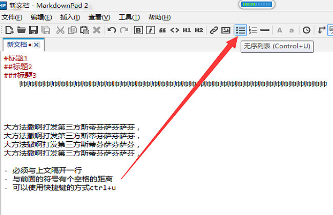 7、无序列表。如果你的文章需要用到无序列表。可以使用ctrl+u。注意使用无序列表必须与上文隔开一行才有效。也可以使用 - 符号加空格的方式。当然工具栏上直接选择无序列表图标也没问题。