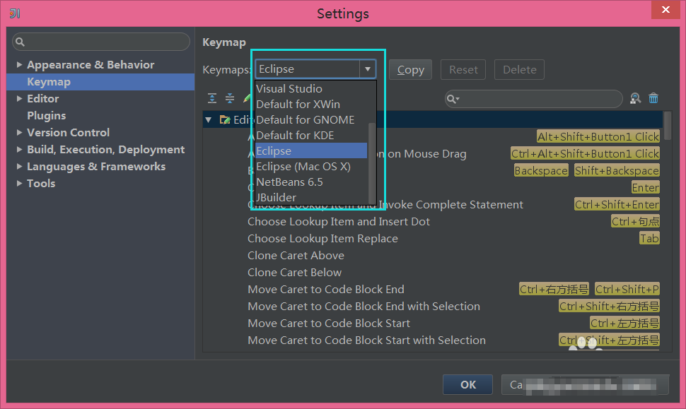 4、在右侧的Keymaps下拉列表中选择“Eclipse”,或者其他自己习惯的预设风格。