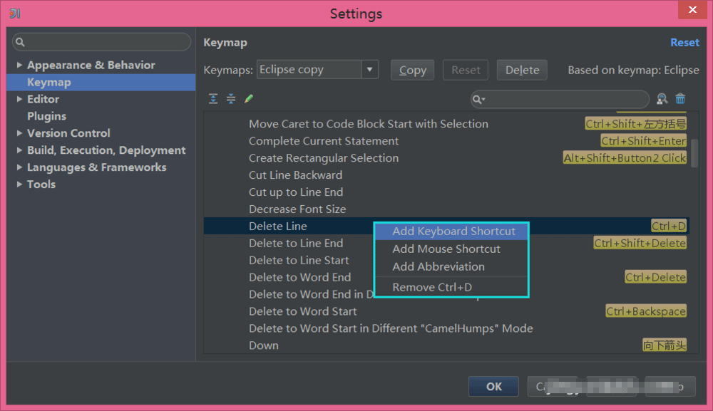 5、如果想要修改某个功能的快捷键,选择一个功能,如“Delete Line”,单击鼠标右键,在邮件菜单中选择相应的快捷键方式。