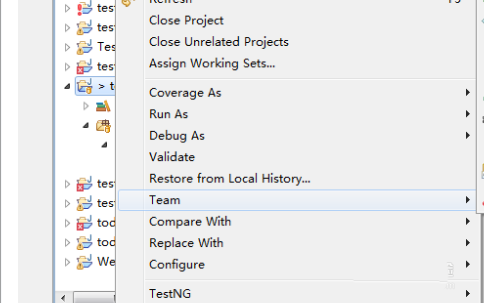 2、然后进行选中需要合并分支代码项目进行右键后,弹出了下拉菜单中进行选择为team的选项。