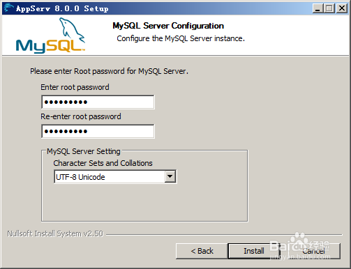 6、配置AppServ中的Mysql服务用户名和密码 MySql服务数据库的默认管理帐户为root,默认字符集为UTF-8,可根据需要自行修改相关的字符集编码,填写完成点击Install开始安装。