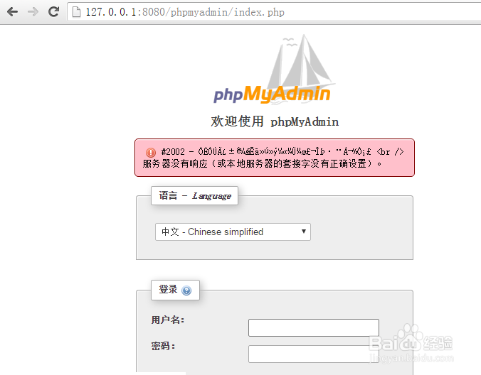 10、问题来了,如果登录出现如下图错误,错误信息为” #2002 - ÓÉÓÚÄ¿±ê¼ÆËã»ú»ý¼«¾Ü¾ø£¬ÎÞ·¨Á¬½Ó¡£ <br />服务器没有响应(或本地服务器的套接字没有正确设置)。“,则说明mysql服务没有正确启动。如果没出现这个#2002错误的可以跳过此步骤。