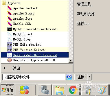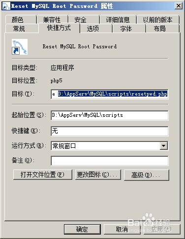 点击“开始-->所有程序-->AppServ”,在“Reset MySQL Root Password”上右击鼠标,点“属性”,可以看到,执行的是“D:\AppServ\MySQL\scripts\resetpwd.php”,用记事本打开该文件,找到“exec ('start /b C:\AppServ\MySQL\bin\mysqld.exe --skip-grant-tables --user=root');”这一行,将"C:\"改为我们安装的盘符“D:\",保存退出后,再次执行”AppServ-->Reset MySQL Root Password”,重新输入Root的密码,正常的话,重置密码窗口正确执行后就自动关闭。