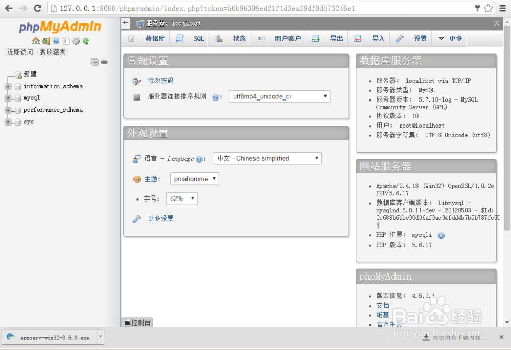 16、再次执行步骤9,用浏览器打开“http://127.0.0.1:8080/phpmyadmin/”,输入root帐号密码登录 。这下终于进入“phpmyadmin”工具的管理界面了。