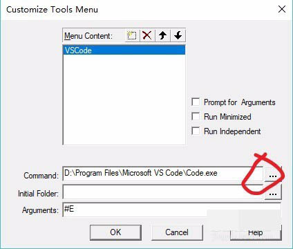 4、然后就是选择vscode程序的位置,点击下面三栏中的第一栏后面的三个点按钮选择vscode程序;如下图所示;