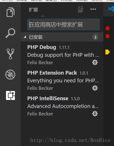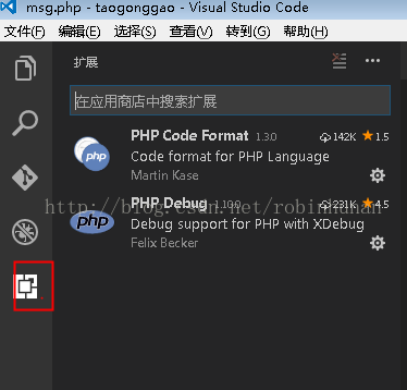 具体为:按ctl+shif+x 或者点 红色的“扩展标签“ , 输入xdebug即可安装