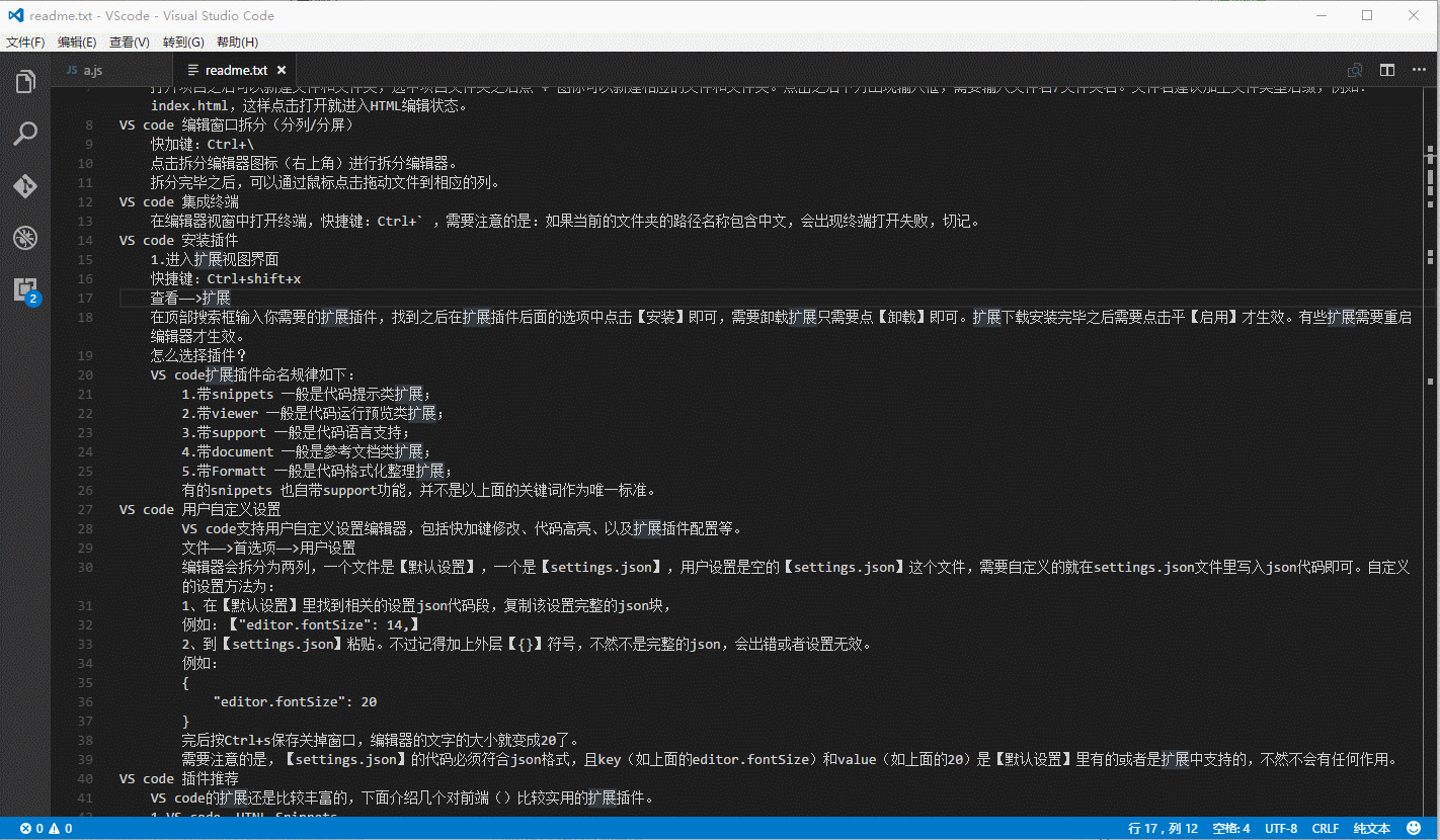 需要注意的是,【settings.json】的代码必须符合json格式,且名称(如上面的editor.fontSize)和值对(如上面的20)是【默认设置】里有的或者是扩展中支持的,不然不会有任何作用。