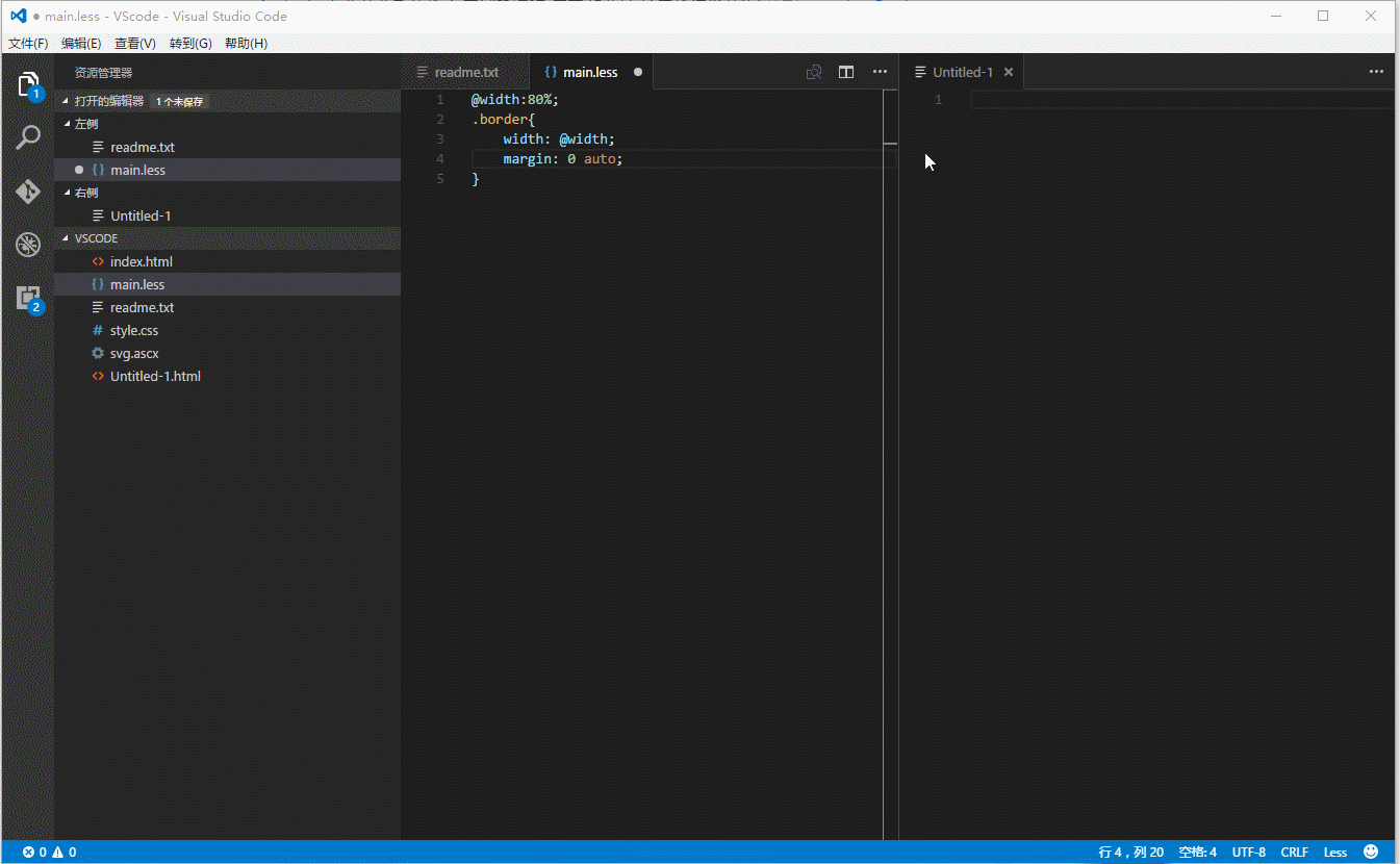 点击拆分编辑器图标(右上角)进行拆分编辑器。拆分完毕之后,可以通过鼠标点击拖动文件到相应的列。多列同时浏览免去多文件来回切换。