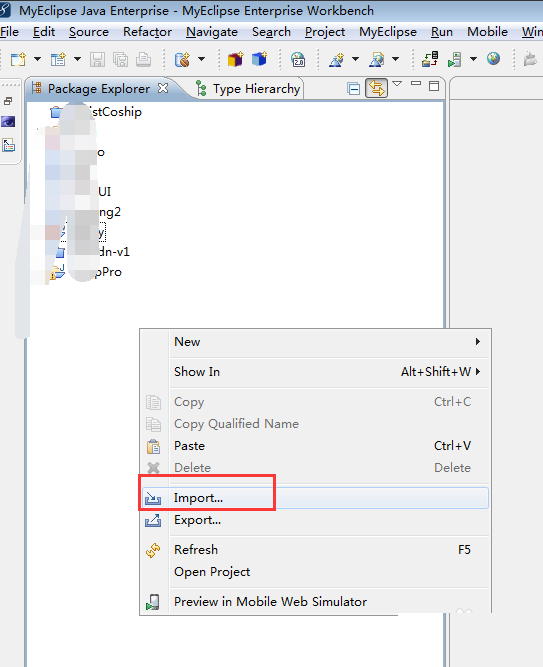 3、在打开的myeclipse左侧空白处点击右键,找到Import选项
