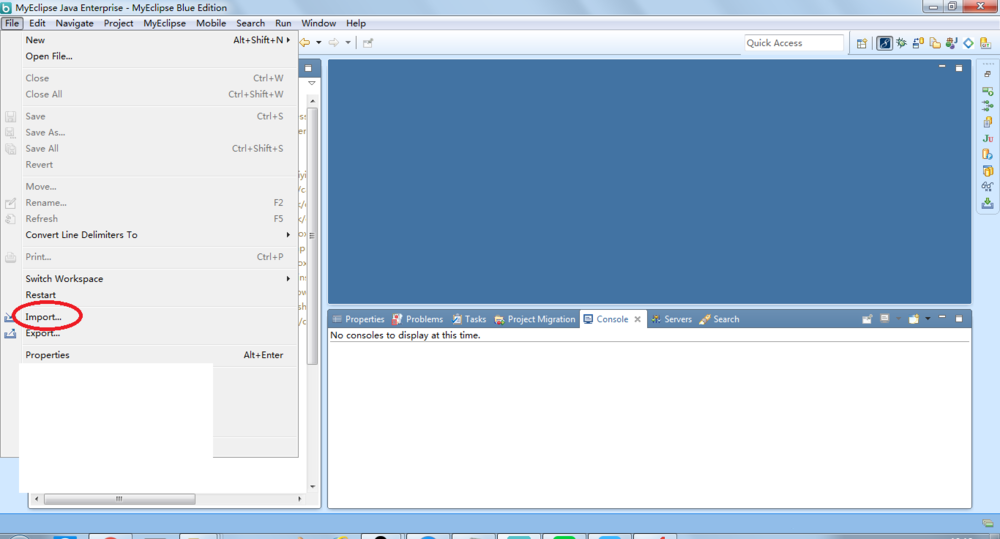 1、打开myeclipse工具的文件(file)菜单列表,选择图中指出地方,如图