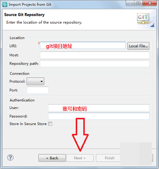 4、点击下一步进入到git项目获取信息配置页面,配置地址和账号密码,其他的都是自动生成或默认不设置,如图