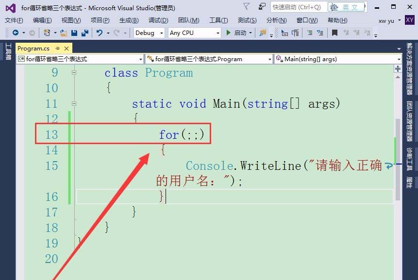 6、死循环语句是不是都没有用的呢?我们可以巧用“死循环”,在控制台窗体中循环输入数据。首先,输入一个for循环语句,省略所有的表达式。