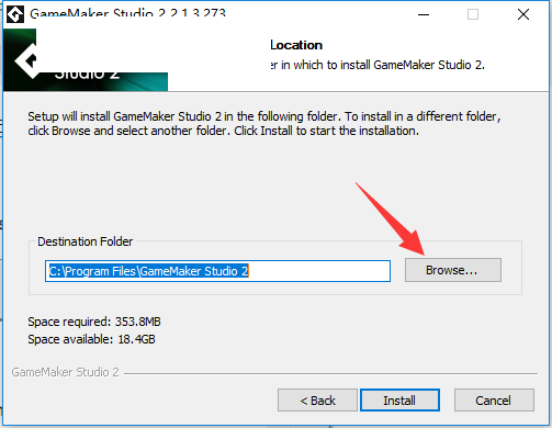 4、点击浏览按钮选择安装路径F:\闪电下载\GameMaker Studio 2,点击install安装
