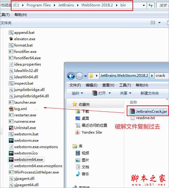 5、这时将破解文件Crack.rar解压出来,再将“JetbrainsCrack.jar”复制到软件安装目录【C:\Program Files\JetBrains\WebStorm 2018.2\bin】;