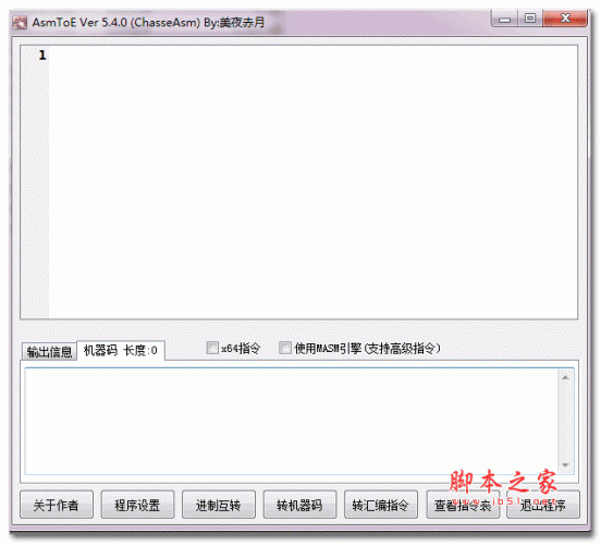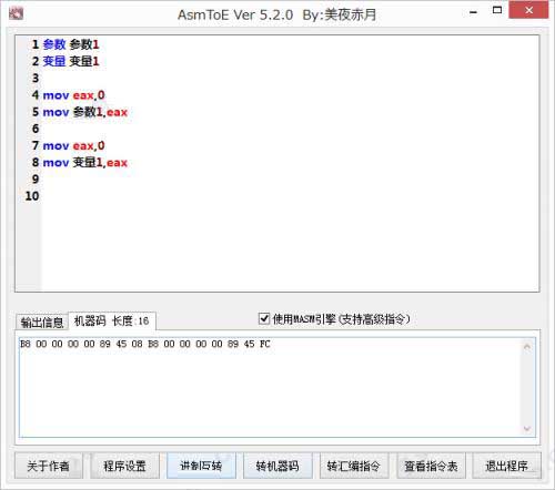 AsmToE是由网友:美夜赤月采用易语言自主编写的一款绿色免费,功能实用的汇编转换器。它能够帮助用户快速进行错误代码检测,支持汇编功能,进制互转、转机器码、转汇编指令、查看指令表等功能,支持代码高亮,用户可以自定义高亮文本,有切行背景颜色、增加算法、增加字节集转Masm格式汇编指令,支持高级汇编指令的转换,免安装,打开即用,有兴趣的朋友请下载使用!