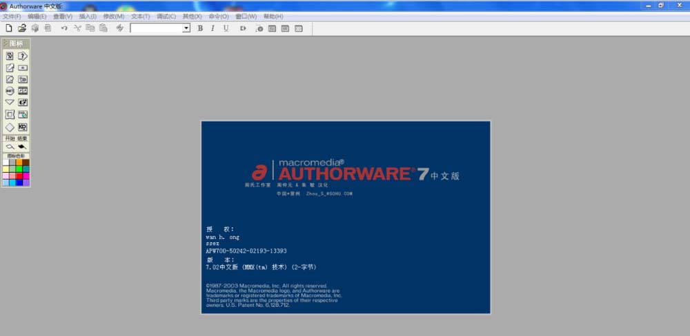 1、首先在电脑中找到所安装的Authorware软件,打开该软件,首先出现的是一个Authorwar版本及授权信息,我使用的是正版软件,所以有注册时自己填写的有关信息;