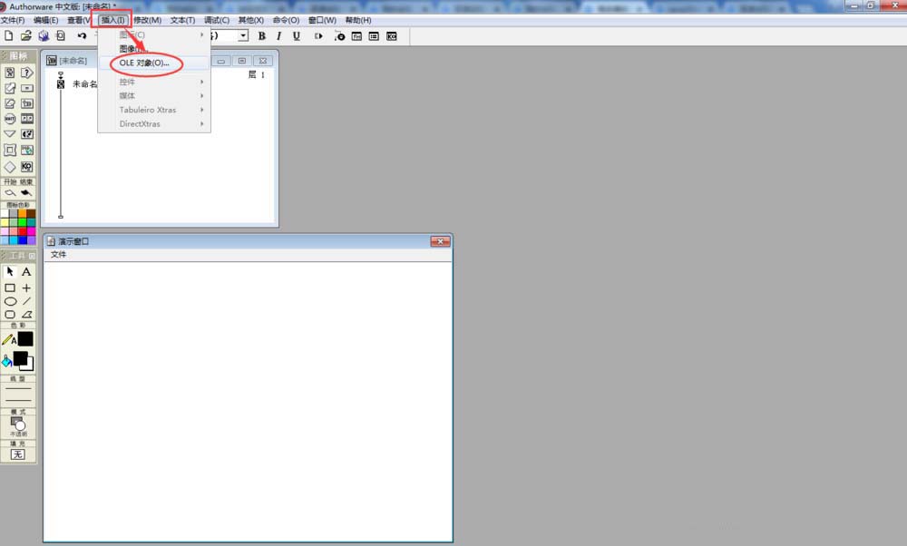 5、在Authorwar的菜单栏中找到插入菜单,然后点OLE对象;