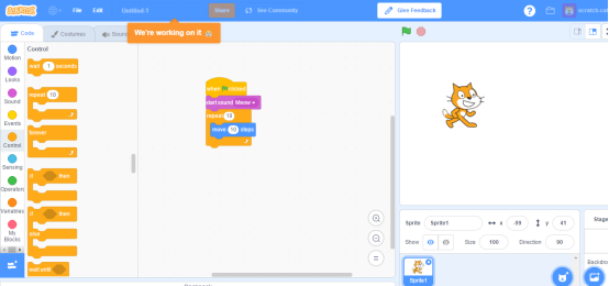 在积木区,单击 【Control】,拖动 【repeat 10】到程序区,