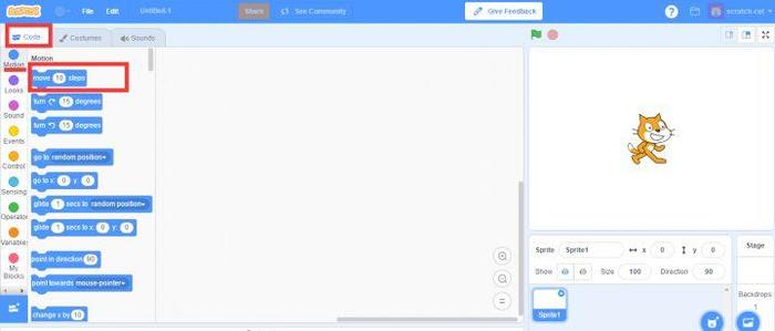 单机积木块,在界面右上方的舞台区,能看到小猫会向前移动。