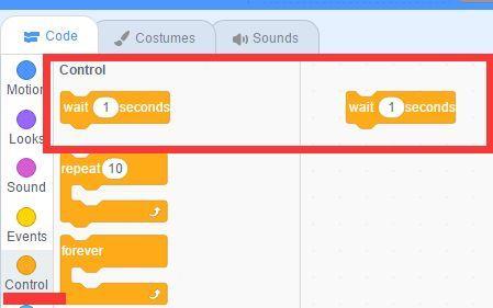拖动 【Control】积木区的【wait 1 seconds】,可让程序暂停1秒。