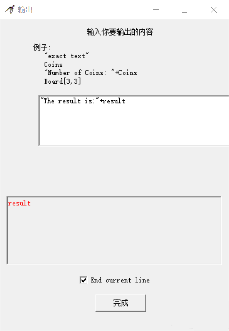 6、在输出框输入 "The result is:"+result 也可直接输入 result 你可以试一试这两个运行结果有何不同
