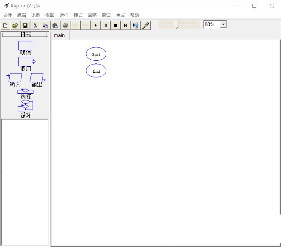 1、双击Raptor软件,打开软件。会弹出两个窗口,一个是操作台,写程序用的。一个是主控台 运行、监测程序用的。在左边的是流程符号,可以单击拖到流程图中。