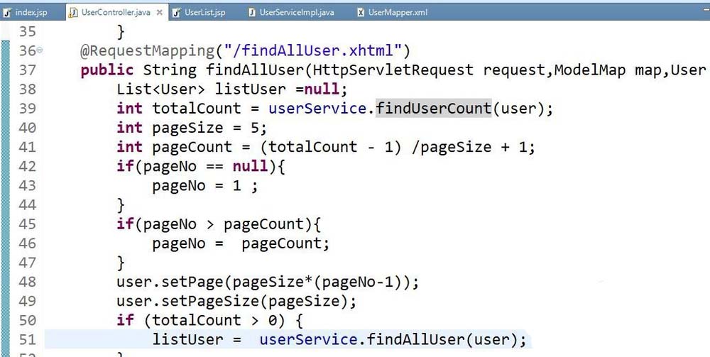 3、在后台控制层调用服务层的userservice.findAlluser函数,具体代码如下图。