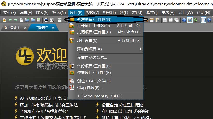 1、打开UltraEdit软件,点击菜单栏的“项目”->“新建项目/工作区”,准备新建项目。