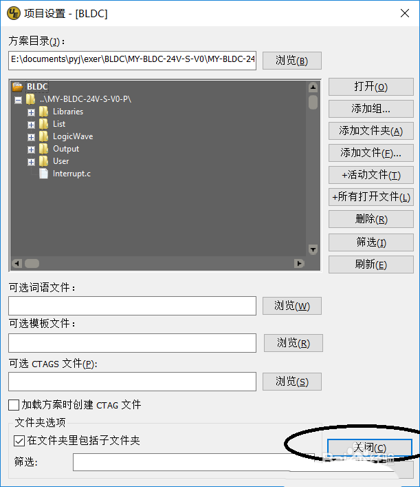 5、“项目设置”下面有个“在文件夹里包括子文件夹”选项,勾选可以将子文件夹的文件一并包含到工程目录,最后通过“关闭”按钮确认上述操作。