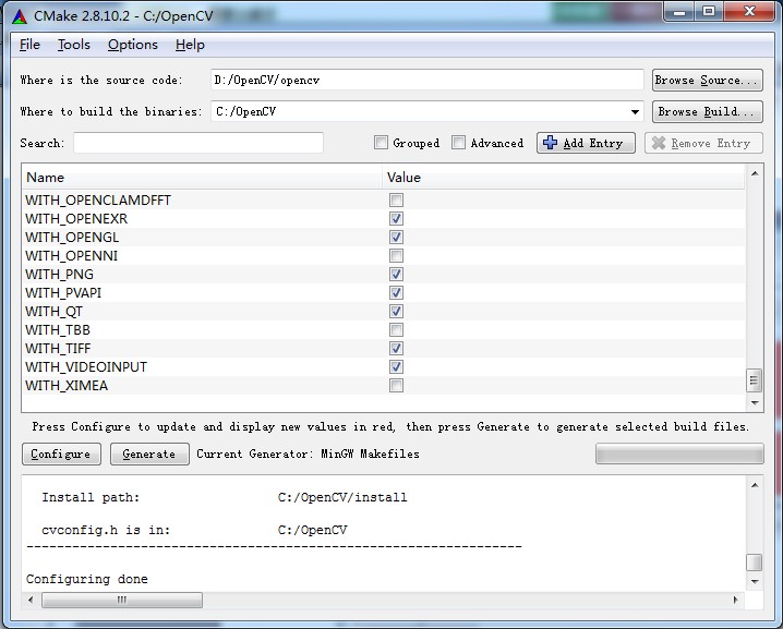 打开CMake,使用CMake编译OpenCV。配置源码路径与生成的目标路径