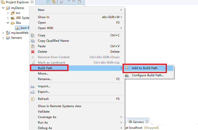 4、然后我们右击复制进去的jar包,选择“build path”,然后点击“Add to build path”。