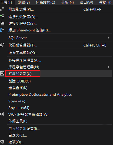 1、打开Visual Studio(以下简称VS)之后,在上方选项栏找到工具选项,点开之后找到扩展和更新。